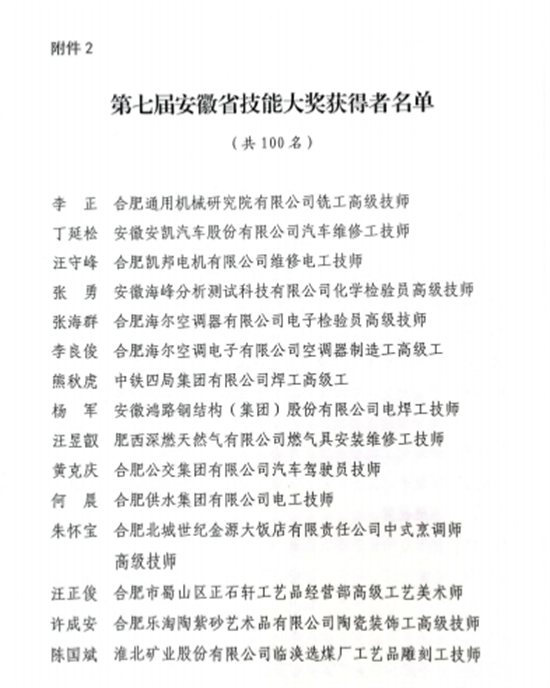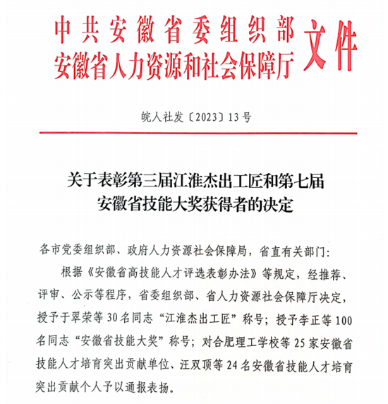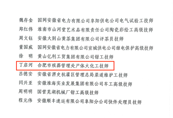 近日,根据省委组织部、省人力资源和社会保障厅《关于表彰第三届江淮杰出工匠和第七届安徽省技能大奖获得者的决定》(皖人社发〔2023〕13号)文件精神,合肥市殡葬管理处处长丁启河荣获“安徽省技能大奖”称号。